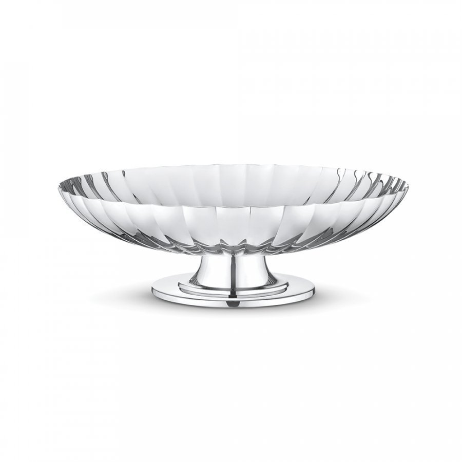 Prinssi Sigvard Bernadotte (1907-2002) allekirjoitti sopimuksen Georg Jensenin kanssa vuonna 1930, jossa hän lupasi uudistaa yrityksen perinteistä muotokieltä funktionalistisessa hengessä. Tuloksena olivat tyylikkäät, graafiset ja selkeät linjat, jotka tulivat selvästi esille monissa hänen suunnittelemissaan hopeaesineissään. Fantastinen jalallinen kulho, joka on valmistettu Bernadotten aikaisempien töiden innoittamana. Kulho lepää kauniisti yhden jalan varassa, joka muistuttaa muodoltaan Bernadotten klassista kynttilänjalkaa. Kulho on valmistettu peilinkiiltävästä, ruostumattomasta teräksestä ja se täydentää tyylikkäästi sarjan muita osia.