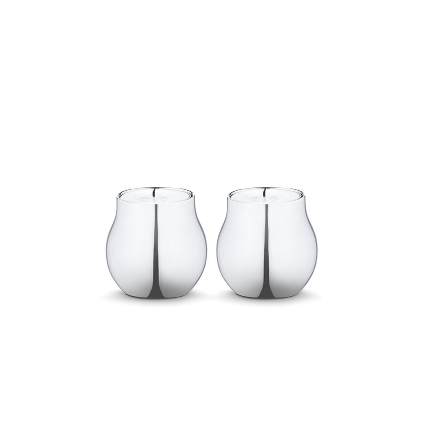 Elegantit ja tyylikkäät kynttilälyhdyt Georg Jenseniltä, jotka on suunnitellut Holmbäck Nordentoft. Kynttilänjalat kauniilla linjoilla on valmistettu ruostumattomasta teräksestä. Puhdista kynttilälyhdyt lämpimällä vedellä ja miedolla saippualla ja kuivaa ne puhtaiksi pehmeällä pyyhkeellä, jotta kirkas pinta ei kärsi.