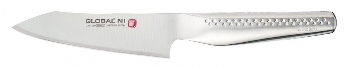 Käytännöllinen Santoku-veitsi 13 cm terällä on ammattikokkien suosima apuväline keittiöön. NI-sarjan veitset ovat valmistettu ruostumattomasta teräksestä nimeltään Cromova 18 ja tämä terästyyppi on erittäin helppo pitää puhtaana. Tämän sarjan veitset ovat teroitettu ennen myyntiä, joten voit huoletta ottaa veitset suoraan käyttöön. Kahva on hieman suurempi kuin aikaisemmissa GLOBAL -veitsissä ja sen kapeneva muoto tekee veitsestä tukevan ja mukavan käsitellä.