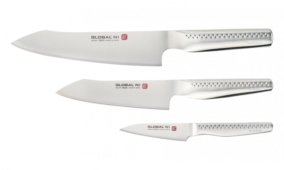 GLOBALin veitset ovat korkealaatuisia ja sopivat niin koti- kuin ammattikokillekin. Tämä on hyvä perussetti veitsiä keittiöön kuin keittiöön. GN-009 on monikäyttöinen 20 cm kokkiveitsi joka on hyvä investointi jokaiseen keittiöön ja kuten muutkin sarjan veitset, valmistettu ruostumattomasta teräksestä nimeltään Cromova 18. Tämä terästyyppi on erittäin helppo pitää puhtaana. GNM-07 on käytännöllinen 15 cm vihannesveitsi ergonomisella kahvalla. GNFS-01 on monipuolinen 11 cm yleisveitsi jolla pilkkominen ja paloittelu sujuu käden käänteessä. Tämän sarjan veitset ovat teroitettu ennen myyntiä, joten voit huoletta ottaa veitset suoraan käyttöön. Kahva on hieman suurempi kuin aikaisemmissa GLOBAL -veitsissä ja sen kapeneva muoto tekee veitsestä tukevan ja mukavan käsitellä.