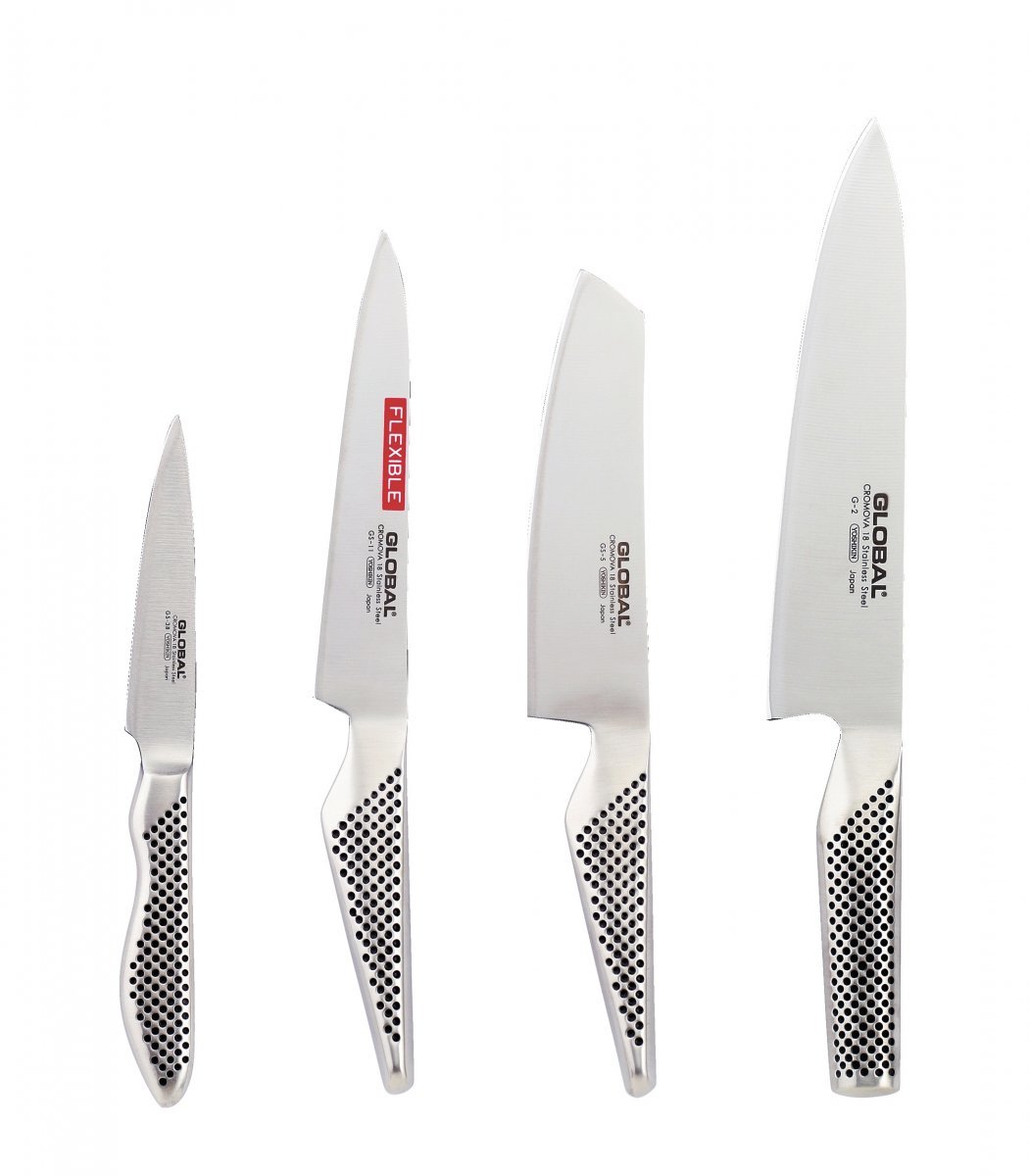 Global -merkin täydellinen veitsisetti. Setti koostuu klassisesta kokkiveitsestä, joka soveltuu lähes kaikkiin keittiön tarpeisiin, pienestä ja käytännöllisestä korkealla terällä varustetusta vihannesveitsestä, taipuisasta yleisveitsestä, joka sopii hyvin lihan käsittelyyn sekä pienestä ja näppärästä kuorimaveitsestä ergonomisella kahvalla varusteltuna. G-2, GS-5, GS-11, GS-38