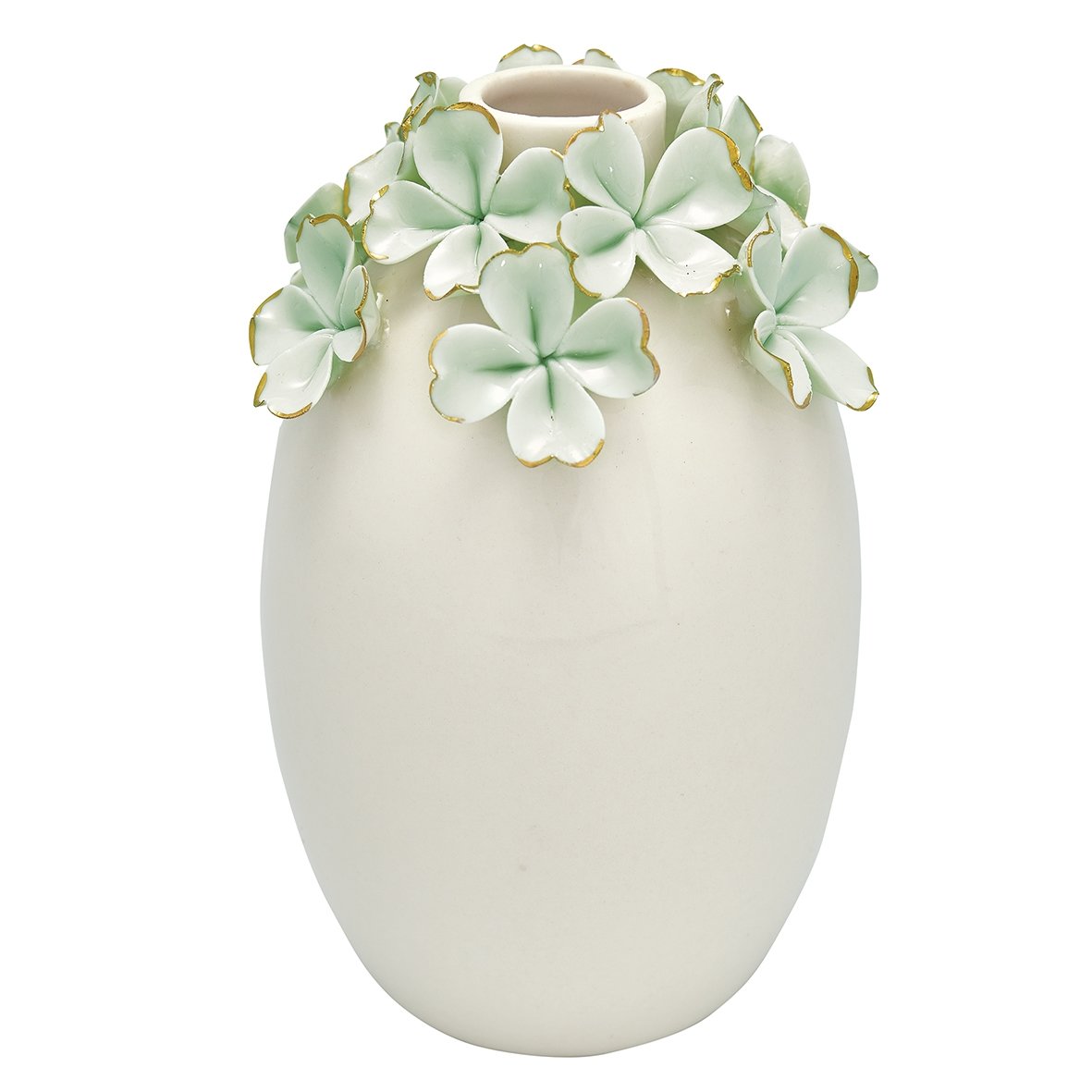 Vaaleanvihreä, keraaminen maljakko on koristeltu ihanilla vaaleanvihreillä kultareunuksisilla kukilla.