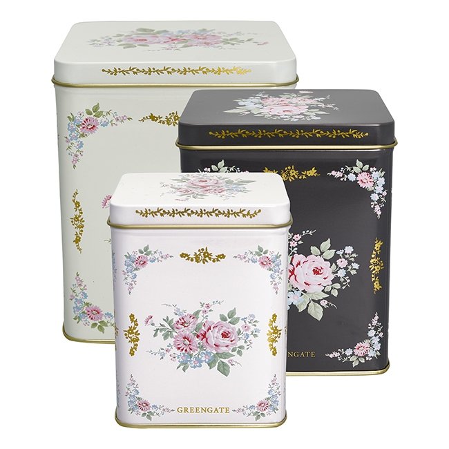Peltipurkit kolmessa eri koossa ja värissä. Purkeissa on kauniit, kultakoristeiset kukat. Large: 15 x 12,5 x 12,5 cm, vaaleanvihreä Medium: 12,5 x 10 x 10 cm, musta Small: 10,5 x 8 x 8 cm, vaaleanpunainen