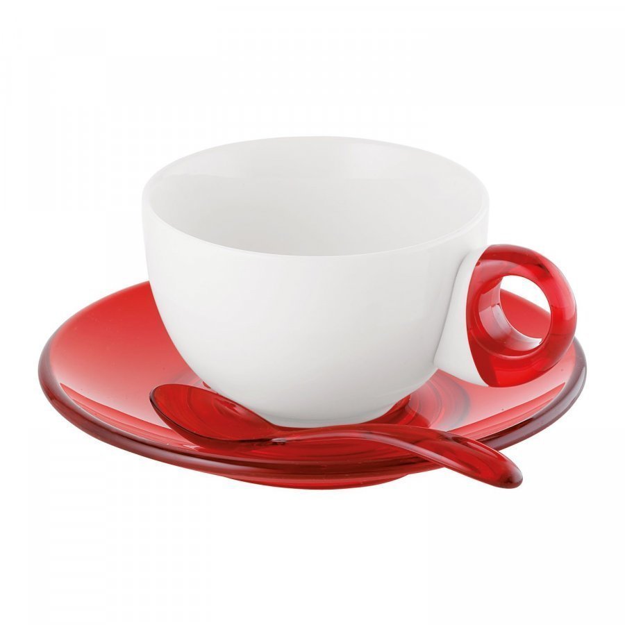 Cappuccinosetti merkiltä Guzzini, muotoillut Queensberry Hunt Levien. Täydellinen ja uniikki muovin ja posliinin kombinaatio. Kuppi on valmistettu posliinista, ja kupin korva muovista, jonka vuoksi et koskaan polta sormiasi. Vati on myrkytöntä ja kierrätettyä SAN-muovia. Settiin kuuluu kaksi kuppia vadilla ja kaksi lusikkaa. Toimitetaan 2-pakkauksena. Tilavuus: 200 ml.