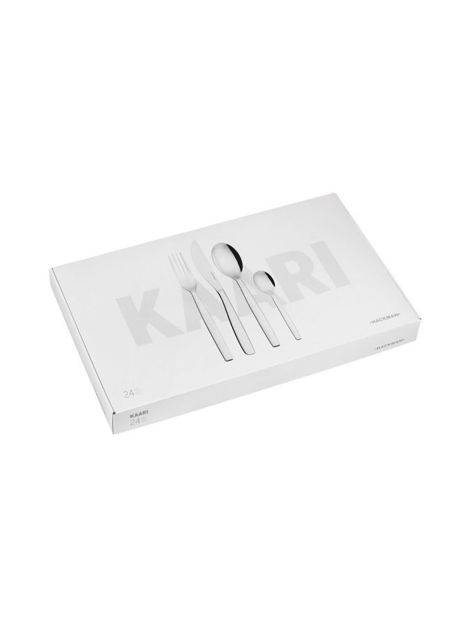 Kaari-sarjan aterimien sulavat ja modernit muodot säväyttävät kaikissa kattauksissa. Materiaali on konepestävää, ruostumatonta terästä. 24-osaisessa lahjapakkauksessa on 6 ruokahaarukkaa, 6 ruokaveistä, 6 ruokalusikkaa ja 6 kahvilusikkaa.