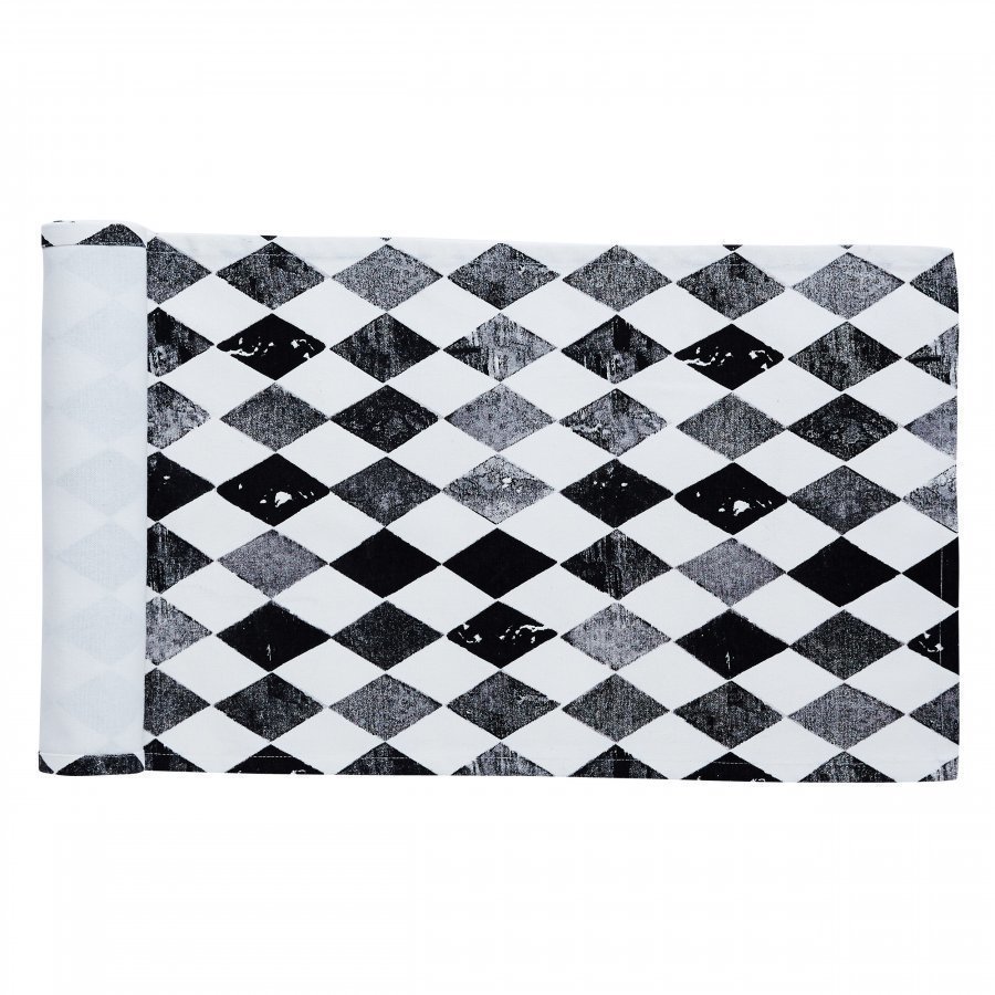 Kudottu kaitaliina, jossa painettu klassinen harlekiinityylinen kuvio. Koristeellinen ja suojaa samalla pöytää. Konepesu 40 asteessa.