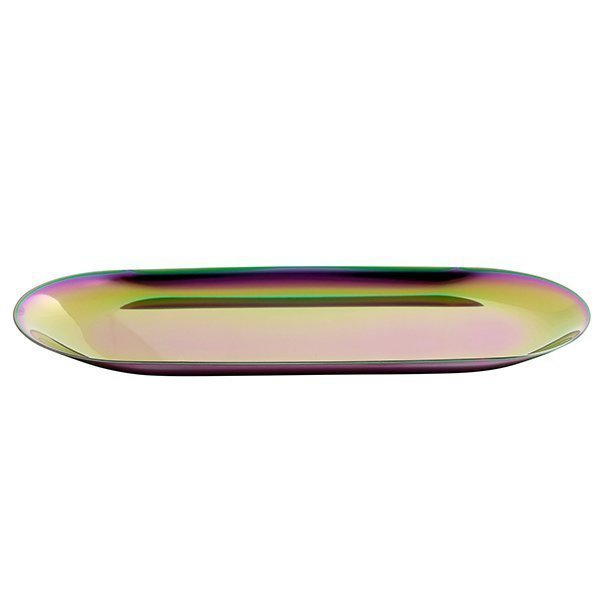 Hayn soikea, sateenkaaren väreissä hehkuva tarjotin on paitsi ihastuttava sisustusesine myös oivallinen paikka avaimille, kynille ja muille pienille esineille. Ruostumattomasta teräksestä valmistetun tarjottimen mitat ovat 23 cm x 9,5 cm.