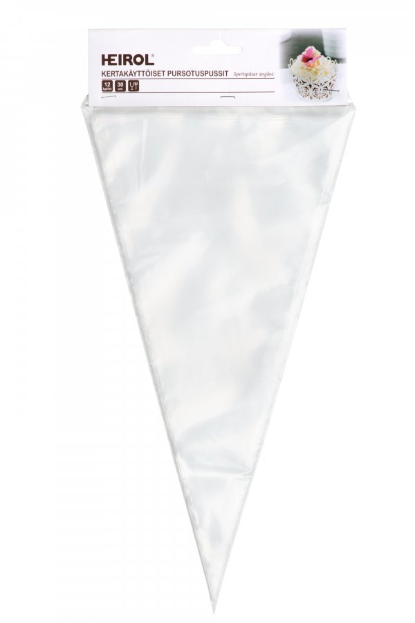 Pieni kertakäyttöinen pursotuspussi on helppokäyttöinen ja hygieeninen vaihtoehto leivonnaisten koristeluun! Pieni pussi on paras vaihtoehto erityisesti pienempiä määriä koristeltaessa, tai jos haluat käyttää eri värisiä tai erimallisia pursotuksia koristeiden teossa. Heirolin yksittäispakatut pursotinpussit ovat kestävää elintarvikekelpoista muovia. Tukevan mutta pehmeän pussin käyttö on helppoa. Pussi soveltuu käytettäväksi erilaisten pursotustyllien kanssa. Jos haluat vaihtaa tyllaa erilaisten pursotusten tekoon, aseta pussin sisään tyllaliitin, johon liität erilaisia Heirol koristelutyllia.