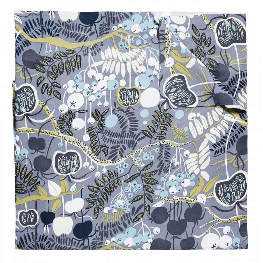 Pintakäsitelty pöytäliina, jonka kuosi on Hemtexin ja kuvittajamuotoilija Ulrika Gustafssonin yhteistyössä syntyneestä