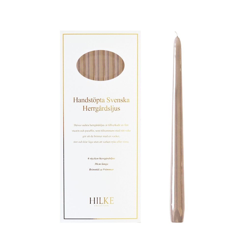 Ruotsalaisen tuotemerkin Hilke Collectionin käsintehdyt kynttilät kauniissa pellavan värissä. Kynttilät on valmistettu steariinista ja parafiinista, minkä ansiosta kynttilän liekki on iso ja kirkas. Steariini ei valu, eikä kynttilä savuta. Kynttilät ovat 30 cm pitkiä ja ne palavat noin yhdeksän tuntia. Ne toimitetaan kauniissa lahjapakkauksessa, jossa on kuusi kynttilää. . Huomioi:. Älä jätä kynttilää yksin palamaan. Aseta kynttilä lasten ja eläinten ulottumattomiin. . Älä laita kynttilää vetoisaan paikkaan. Pidä kynttilä kaukana helposti syttyvistä materiaaleista. .