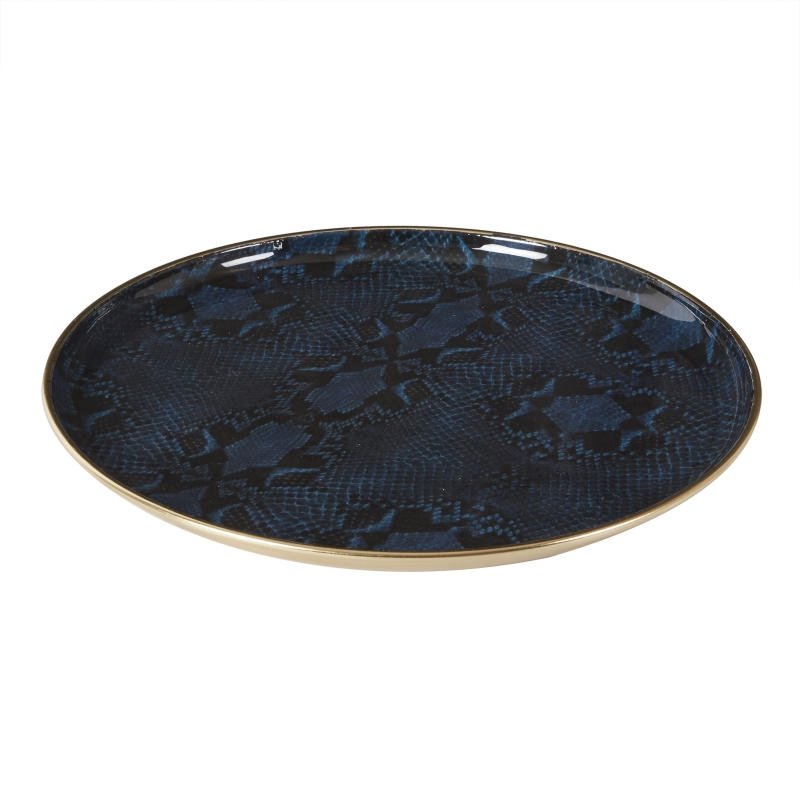 Kaunis tarjoiluvati, jonka pintaa koristaa käärmeennahkaa imitoiva sinisävyinen kuvio ja kultainen pohjapuoli.