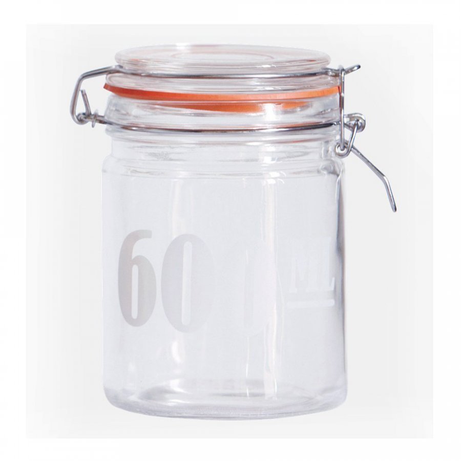 Lasipurkki tiivistekannella. Teksti joka ilmoittaa purkin kapasiteetin. Voidaan pestä astianpesukoneessa mutta metalliosat tulee poistaa ensin. Metalliosat pestään käsin.