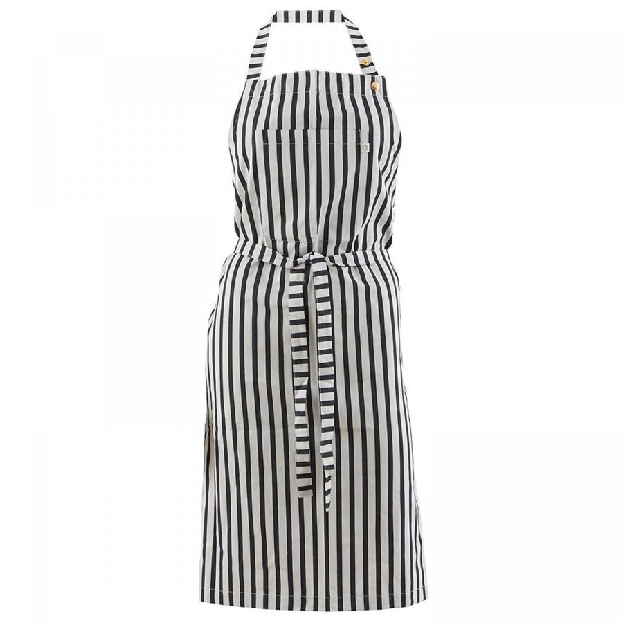 Stripe esiliina, House Doctor. Suojaa vaatteesi tyylikkäästi. Esiliina on valmistettu kokonaan pehmeästä puuvillasta. Esiliina on myös kaunis ripustaa keittiöösi koristeeksi kun se ei ole käytössä. Koristeltu kauniilla kultanapeilla, kankaan ollessa harmaa-musta raidallinen. Pesukoneen kestävä.