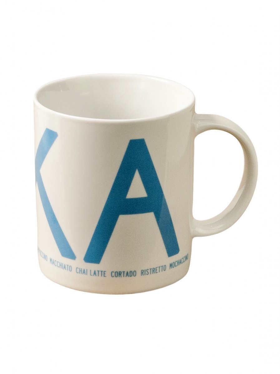 Hauska muki I Love Design -merkiltä. Tarjotin on osa FIKA-sarjaa ja se on valmistettu valkoisesta posliinista, mihin on kirjoitettu ”FIKA” -teksti turkoosilla.