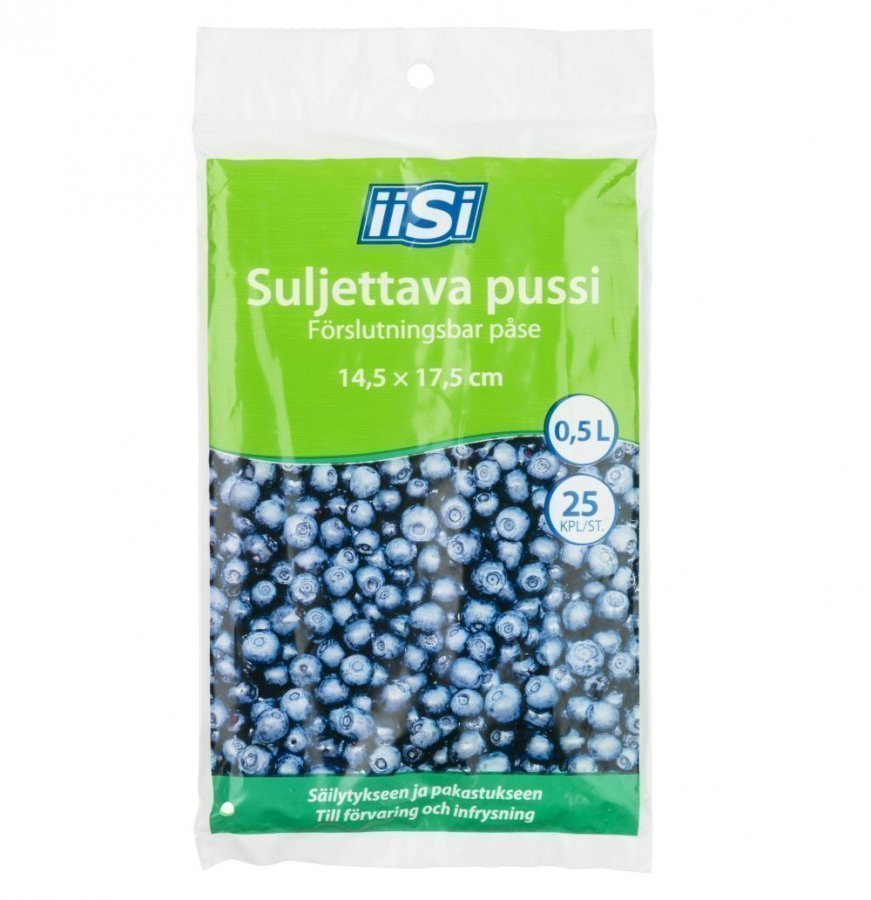 Säilytykseen ja pakastukseen kätevä Iisi pakastuspussi. Suljettavan pakastuspussin koko on 14,5 x 17,5 cm. Vetoisuus 0,5 litraa. Pakkauksessa on 25 kpl pakastuspusseja