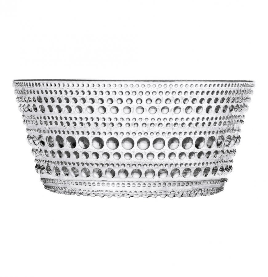 Iittala Kastehelmi kulho. Idea Kastehelmen lasipisaroilla koristellusta pinnasta syntyi, kun Toikka halusi peittää puristelasiin väistämättä jäävät saumakohdat. Näin kehittyi kokonaan uusi pintastruktuuri, joka korosti lasin elävyyttä ja valon heijastumia. Kastehelmi on ollut aiemmin tuotannossa 1964-1988 ja suosituimmat osat palasivat valikoimiin vuonna 2010. Kulho on konepesun kestävä. Kulhon vetoisuus on 23 cl, väri kirkas.