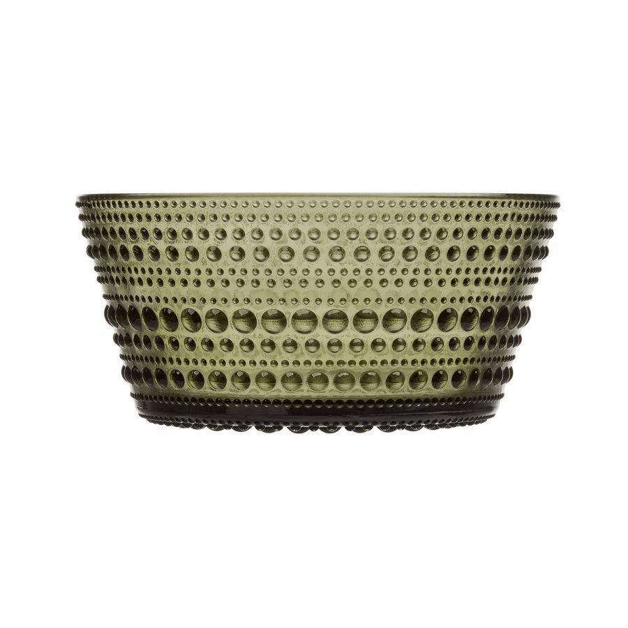 Kastehelmi kulho merkiltä Iittala, suunnittelija Oiva Toikka. Tämä lasisarja sai alkunsa jo vuonna 1964. Sarjan muotoilu on saanut inspiraation ilmakuplista, jotka tekevät lasista elävän ja jännittävän. Tässä kulhossa on kauniin vihreä väri, joka toimii upeana yksityiskohtana ruokapöydässä tai olohuoneessa säilytyskulhona.