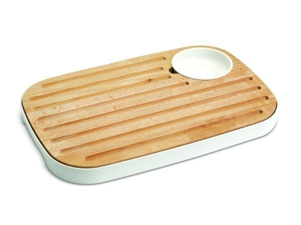 Monikäyttöisessä leikkuulaudassa yhdistyvät leikkuulauta ja melamiininen tarjotin.