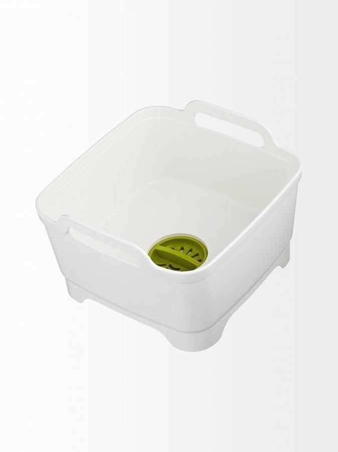 Kätevän tiskivadin pohjassa on tulppa, joka kerää ruoantähteet tiskivedestä ja jota kääntämällä vesi tyhjenee helposti pohjassa olevan aukon kautta. Käyttömukavuutta lisäävät tukevat kädensijat ja jyrkät, korkeat reunat. Materiaali on kestävää muovia. Käsinpesu.