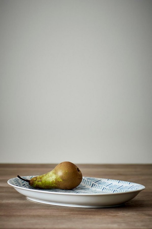 Moderni tarjoiluvati, jossa graafinen viivakuvio. ANNE-sarjassa on eri osia ja neljää eri kuviota, joita voit yhdistellä mielesi mukaan. Luo graafinen kattaus tarjoamalla coctail-palat, ruoka tai kahviherkut ANNE-tarjoiluvadilta. Materiaali: Posliinia. Koko: ø 30 cm. Kuvaus: Tarjoiluvati lasitettua, käsintehtyä posliinia, jossa sininen koristekuvio valkoisella pohjalla. Soikea malli. Valmistettu Portugalissa. Hoito-ohje: Konepesu. Kestävät mikroaaltouunin. Vinkki: Lautasten graafinen kuvio sopii rentoon illalliskattaukseen.
