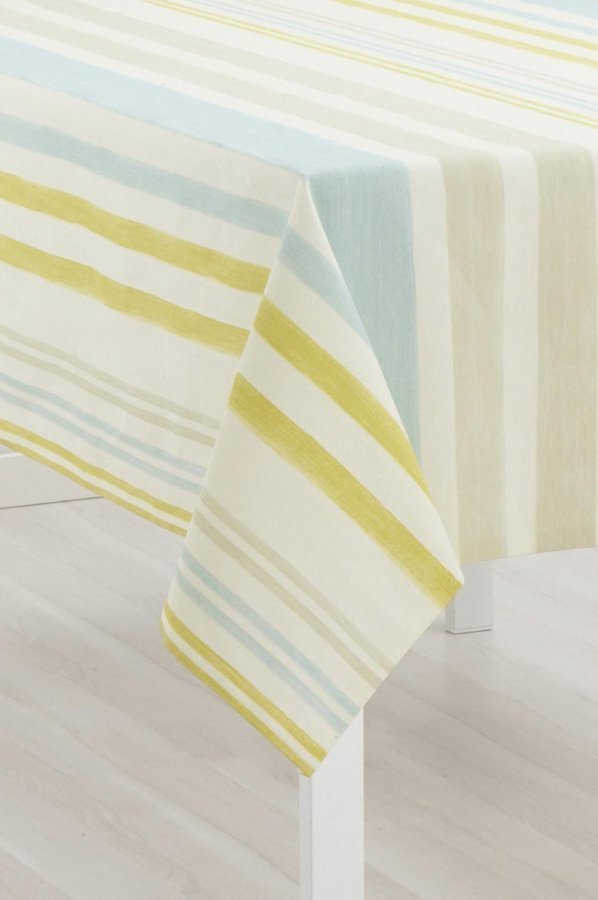 Raidalliset pastellisävyiset tekstiilit sopivat hyvin pohjoismaisiin koteihimme ja sinulle, joka pidät hillitystä, vaaleasta värimaailmasta. Materiaali: 100% puuvillaa. Koko: Leveys 150 cm. Ilmoita koko kun tilaat. Kuvaus: Akryylikäsitelty pöytäliinakangas puolipanamaa, jossa painettu kuvio. Helppo pyyhkiä puhtaaksi. Hoito-ohje: Pesu 40°. Kutistuu enintään 5%. Vinkki: Sini-vihreät sävyt sopivat hyvin tumman ja vaalean nahan sekä erilaisten puupintojen rinnalle. Balencia sopii hyvin yhteen FLORENTINAN aaltoilevan lehtikuvion kanssa.