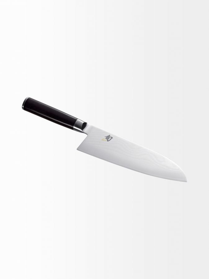 Ammattilaisten ja harrastelijakokkien suosima tyylikäs santoku-veitsi on lujaa ja kestävää ruostumatonta damaskiterästä, jonka valmistus vaatii mestarillisia sepäntaitoja. Japanissa valmistetussa veitsessä yhdistyvät perinteinen japanilainen käsityö, moderni teknologia ja design. Terän pituus on 18 cm. Käsinpesu.