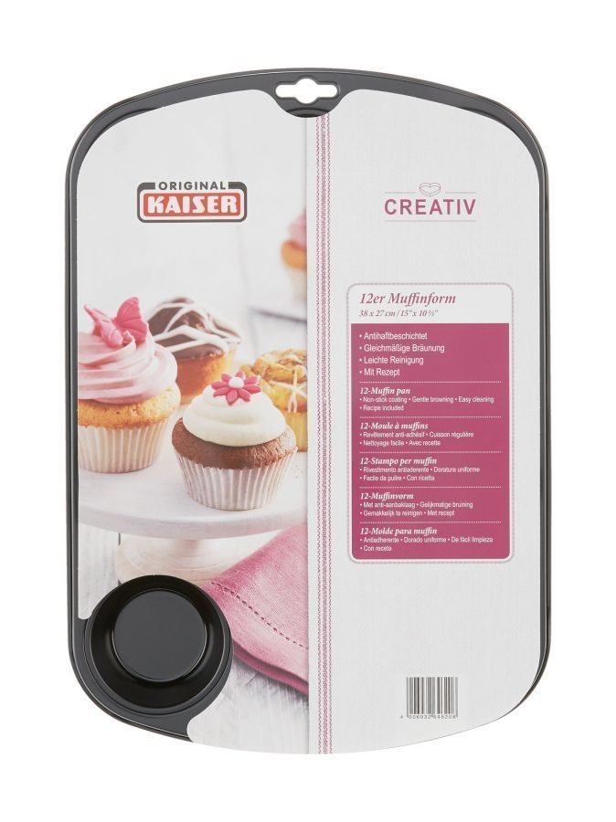 Kookkaalle muffinipellille mahtuu paistumaan 12 herkullista muffinia. Pellissä on tarttumaton non-stick-päällyste ja mukana tulee myös muffiniresepti. Pelti on helppo puhdistaa.