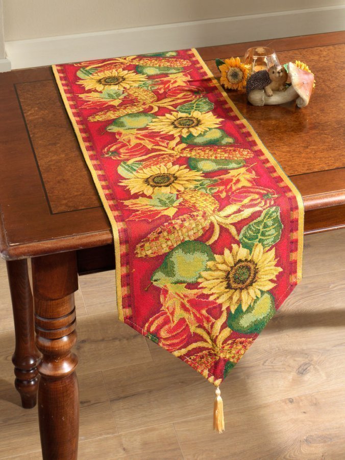Kaitaliina ’Auringonkukka’. Helppohoitoista ja kestävää gobeliinikangasta. Mitat n. 33 x 160 cm. Tilattavissa erikseen koristetyynynpäällinen samasta sarjasta tuotenumerolla 507889.