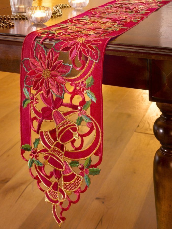 Kaitaliina ’Lea’. Jouluista kirjontaa ja pitsimäisesti leikattu kuviointi. Kärjelliseksi leikatut päädyt. Materiaali polyesteriä.