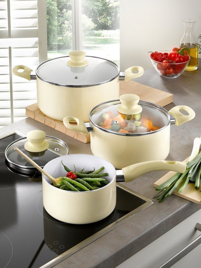 6-osainen kattilasetti, jossa on sisäpuolella naarmuuntumaton ja tarttumaton keraaminen pinnoite. Soveltuu kaikille liesityypeille, myös induktioliesille. Helppo käsitellä silikonipäällysteisten kahvojen ja nuppien ansiosta. Setin sisältö: 1 kasari Ø 16 cm, 1,2 l, 1 kattila 20 cm, 2,8 l, 1 kattila Ø 24 cm, 4,2 l sekä yksi höyryreiällinen lasikansi kutakin kattilaa varten. Pohjassa valmistajan merkintä. Alumiinipohja, ei voi pestä astianpesukoneessa.