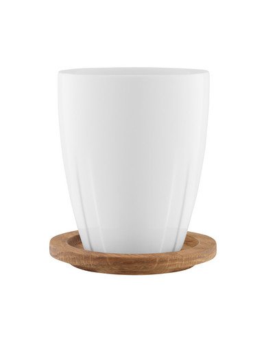 Kaksi kaunista posliini mukia Kosta Bodalta, joiden vetoisuus on 35 cl. Mukien mukana tulee tammiset lasinaluset, joita voi käyttää myös kupin kansina, pitääkseen juoman lämpimänä. Materiaalien seikoittaminen keskenään edustaa pohjoismaista tyyliä.