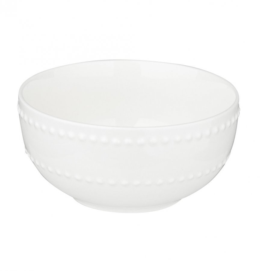 Siron kulhon reunaa koristaa helmiaiheinen kohokuviointi. Materiaali on mikron ja astianpesukoneen kestävää posliinia. Halkaisija 13 cm.