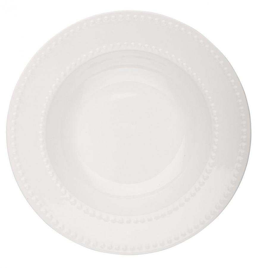 Syvän lautasen reunaa koristaa helmiaiheinen kohokuviointi. Materiaali on mikron ja astianpesukoneen kestävää posliinia. Halkaisija 22,5 cm.