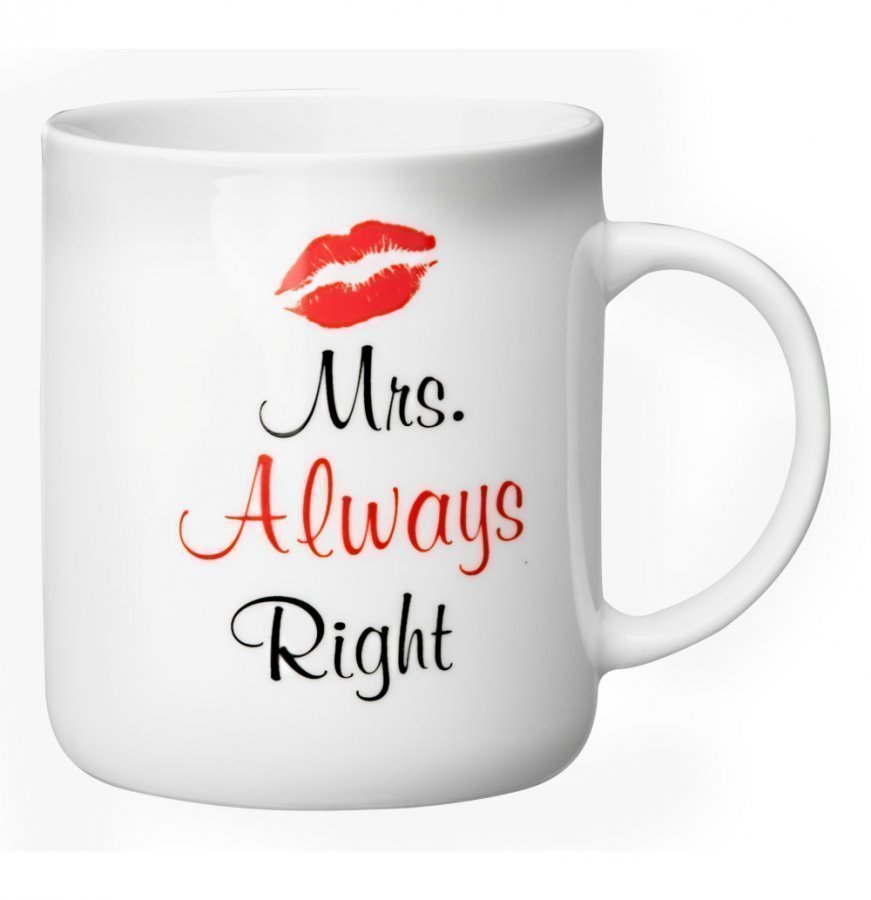 Kotikulta-muki miehelle tai naiselle. Tekstinä Mr. Right tai Mrs. Always Right. Tilavuus 4 dl. Mikron ja astianpesukoneen kestävä. Huom! Tekstiä ei voi valita tilattaessa, toimitus varastotilanteen mukaan.