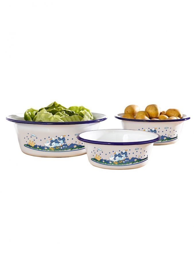 3-osainen kulhosetti. Hanhiaiheinen kuviointi tuo muistoja kotiseudulta, lomalta sekä maalaisseudun idyllistä. Voidaan pestä astianpesukoneessa. Sininen emaloitu reuna ja emaloitu valkoinen sisäpinta. Kulhojen Ø n. 20 cm, Ø 24 cm ja Ø 28 cm.