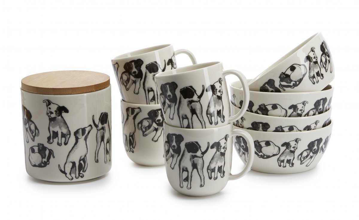 Koira ja kissa ovat Suomen suosituimmat lemmikkieläimet. Koiran ystävät -mukeissa seikkailevat iloiset sekarotuiset luppakorvat. Ostoksille!