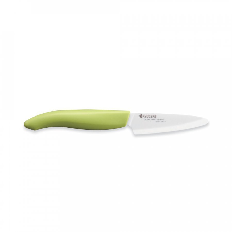 FK merkiltä Kyocera on sarja ergonomisia veitsiä erivärisillä kahvoilla ja korkealaatuisella valkoisella terällä, joka sopii jokaiseen keittiöön. Täydellisiä leikkaamaan hedelmiä, vihanneksia ja lihaa. Veitsillä on fantastinen terävyys ja ne kestävät paljon kauemmin kuin perinteiset terästerät. Pieni keraaminen kuorimaveitsi valkoisella terällä ja punaisella muovikahvalla. Veitsen terä valmistetaan kokoonpuristetusta keramiikasta – maailman kovinta materiaalia timantin jälkeen. Veitsi on kevyt, ei ruostu ja kestää happoja. Vältä vain kovia äyriäisiä, luita ja pakasteita. Konepesunkestävä. Terän pituus 7,5 cm.
