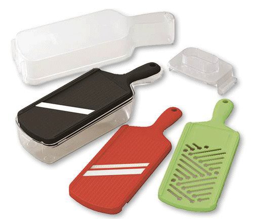 Käytännöllinen mandoliinisetti johon sisältyy viisi osaa, muun muassa julienne -mandoliini, raastin sekä purkki viipaloiduille ja raastetuille raaka-aineille. Mandoliinissa on terävä keraaminen terä ja se on helppokäyttöinen. Neljällä säädöllä 0,5 mm ja 3 mm välillä voit valita haluamasi paksuuden siivutettaville raaka-aineille. Saat helposti siivutettua vihannekset, juurekset, perunat kotitekoisiin sipseihin tai koristukset salaatteihin. Käytön jälkeen mandoliinin voi pestä tiskikoneessa.