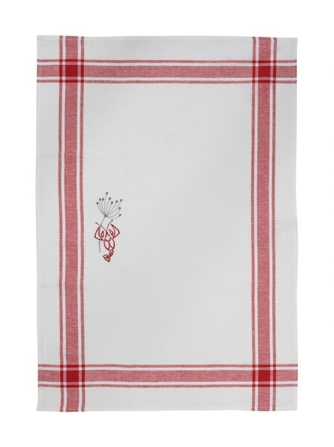 Ihastuttavaa keittiöpyyhettä koristavat rapujuhlasesongin sävyt sekä brodeerattu rapu- ja tillikuviointi.