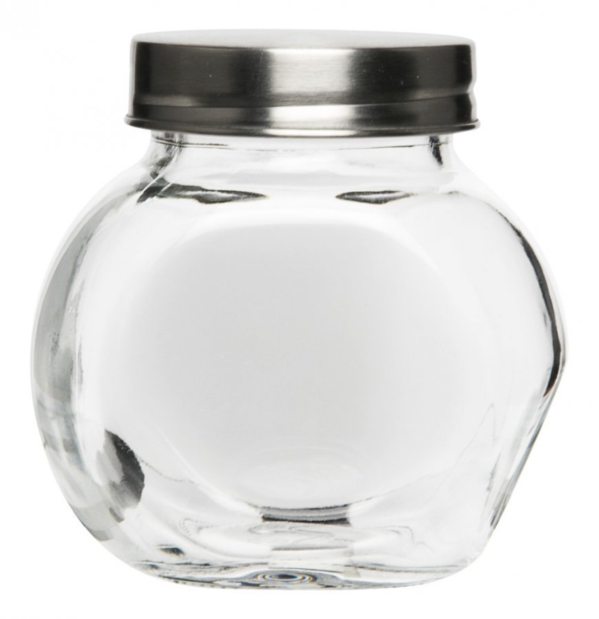 Pieni lasipurkki teräskannella. Lasipurkin tilavuus 195ml.