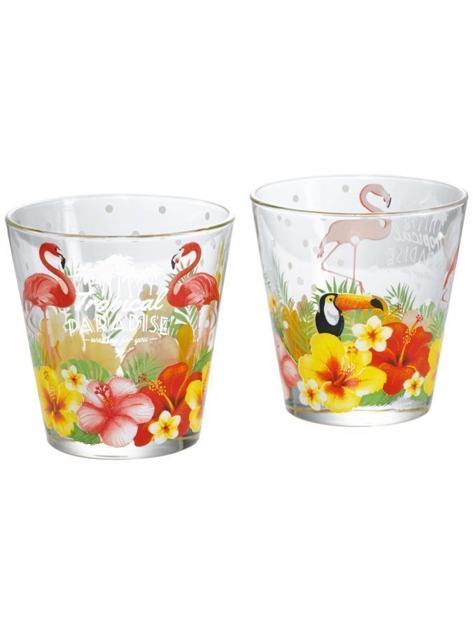 Ihastuttava lasisetti on kuvioitu kaukomaiden inspiroimalla kuvioinnilla. Flamingot, papukaijat ja tukaanit johdattavat mielen etelän lämpöön… Lasissa on painatus ’Tropical Paradise waiting for you’. Nauti raikas kesäjuoma iloisenvärisistä laseista. Sopii myös kesäjuhliin! Tilavuus 250 ml.