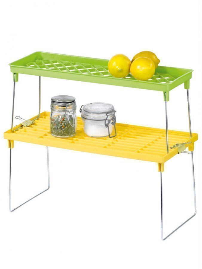 Kätevät, kokoontaitettavat laskutasot kahdessa eri koossa. Helposti kokoon- ja kasaantaitettavat laskutasot sopivat esimerkiksi astioiden kuivaukseen tai käteviksi tarjotinalustoiksi. Setti sisältää kaksi erikokoista laskutasoa. Mitat (PxLxK): vihreä laskutaso 39x14x16,5 cm, keltainen laskutaso n. 39x20c21 cm. Materiaali muovia ja metallia.