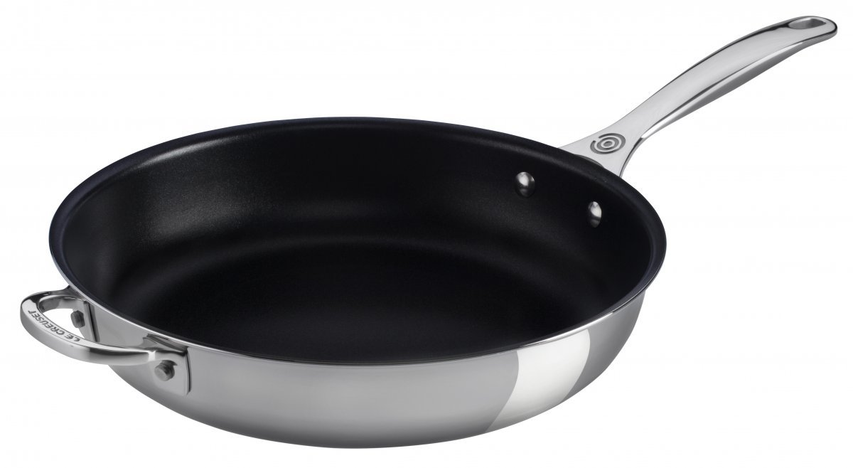 Le Creusetin tyylikäs paistinpannu joka on halkaisijaltaan 32 cm. Pannu kuuluu 3 Ply -sarjaan ja on valmistettu kestävästä ruostumattomasta teräksestä alumiiniytimellä, jotta lämpö jakautuu tasaisesti. Non-stick -pinnoitteen ansioista paistamiseen tarvitaan vain piene määrä rasvaa, eikä ruoka pala kiinni pannun pohjaan. Kahva on mukava käyttää ja sen päässä on reikä, jotta pannun saa säilytettyä roikkuen. Pannu sopii kaikille keittotasoille ja on uuninkestävä aina 220 asteeseen saakka.