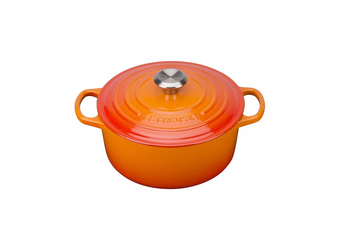 Le Creusetin 4,2 litrainen tulenpunainen valurautainen pata, halkaisijaltaan 24 cm. Pata on osa Signature –sarjaa joka koostuu päivitetyistä valurautaisista tuotteista. Kädensijat ovat nyt suuremmat paremmalla otteella ja padan nuppi on tyylikäs ja teräksinen. Kansi on entistäkin tiiviimpi ja kestävämpi ja sen sisäpuolen emaloitu pinta on helppo pitää puhtaana. Valurauta on materiaalina lyömätön ja jakaa lämmön tasaisesti, pata sopiikin erinomaisesti haudutukseen ja keittojen sekä patojen laittamiseen. Padan voi nostaa suoraan liedeltä pöydälle, ruoka pysyy lämpimänä pitkään. Ajattomasti muotoiltu laadukas pata elinikäisellä takuulla on saatavilla eri värivaihtoehdoissa ja teräksisen nupin voi vaihtaa uuteen.