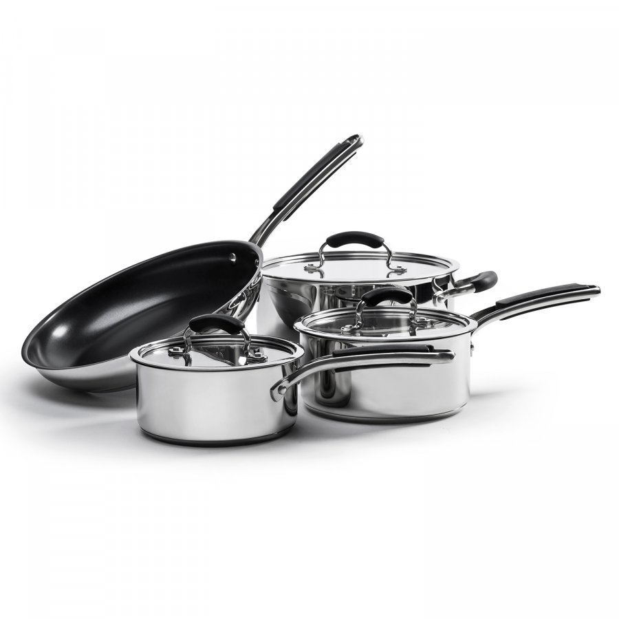 Korkealaatuinen setti. Valmistettu 18/10 ruostumattomasta teräksestä 3mm alumiinieristeestä ja 0,5 mm teräksestä pohjassa, tuomaan parhaan lämpötilan. Pannu on käsitelty tarttumattomalla kolmikerroksisella kvantatiivisella pinnoitteella. Setti sisältää 2 kattilaa 1,4L ja 3L, padan 5L ja paistinpannun 28Øcm. Kaikki tuotteet on varustettu lasikannella. Sopii kaikille liesille, myös induktioliedelle.