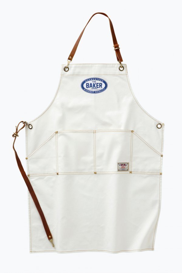 Esiliina paksua ja kestävää luonnonvalkoista puuvillakanvaasia, keltaiset saumat. Iso nelilokeroinen tasku, jossa niitit. Säädettävä nahkainen niska- ja vyötärönauha, jossa helppo hakassuljenta. Mariininsininen Baker-painatus rinnassa. 100% puuvillaa Pesu 40°
