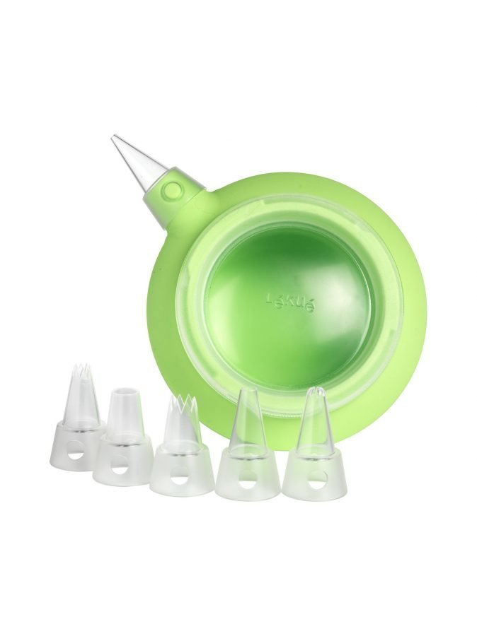 Koristelukynän kuuden erilaisen pursotinnokan avulla koristelet leivonnaiset muffinseista kakkuihin sekä täytät tuulihatut ja macaronit. Monipuolisen, ergonomisen ja helppokäyttöisen koristelukynän kanssa onnistut tekemään niin tekstikoristeet kuin pallot, kukkaset ja punoksetkin. Pursottimen tilavuus on 350 ml.