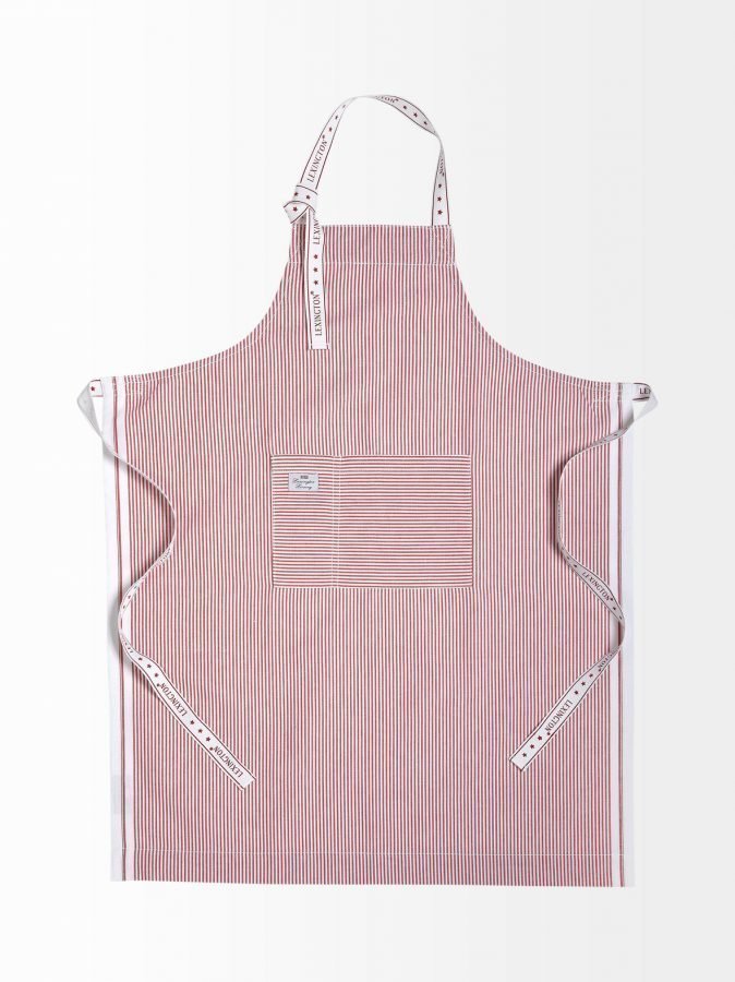 Raitakuosisessa esiliinassa on tähtikuvioidut kiinnitysnauhat, niskahihnaa voi säätää. Edessä on tilava tasku. Materiaali on 100 % puuvillaa. Konepesu 40°C.