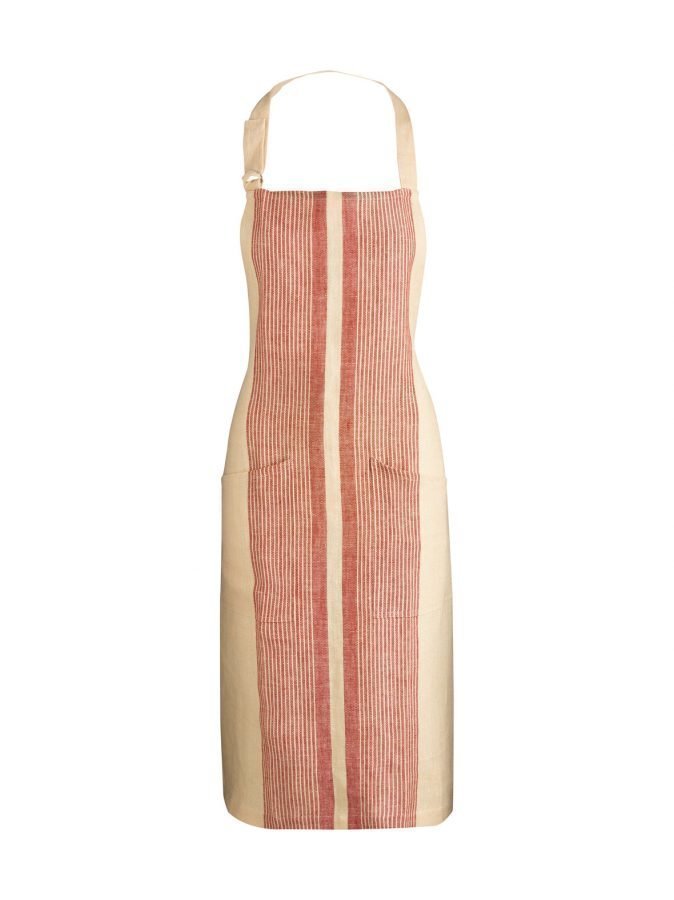 Pehmeästä pellavasta valmistettu raitakuvioinen Linum Mae -esiliina huokuu kotoista tunnelmaa. Edessä on tilavat taskut ja niskanauhassa käytännöllinen solki.