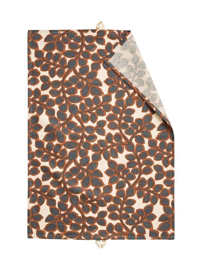 Puuvillakankaasta valmistettua ruskeansävyistä keittiöpyyhettä koristaa Mathias Elovssonin suunnittelema eläväinen kuosi. Pyyhkeessä on lyhyellä sivulla ripustuslenkki.